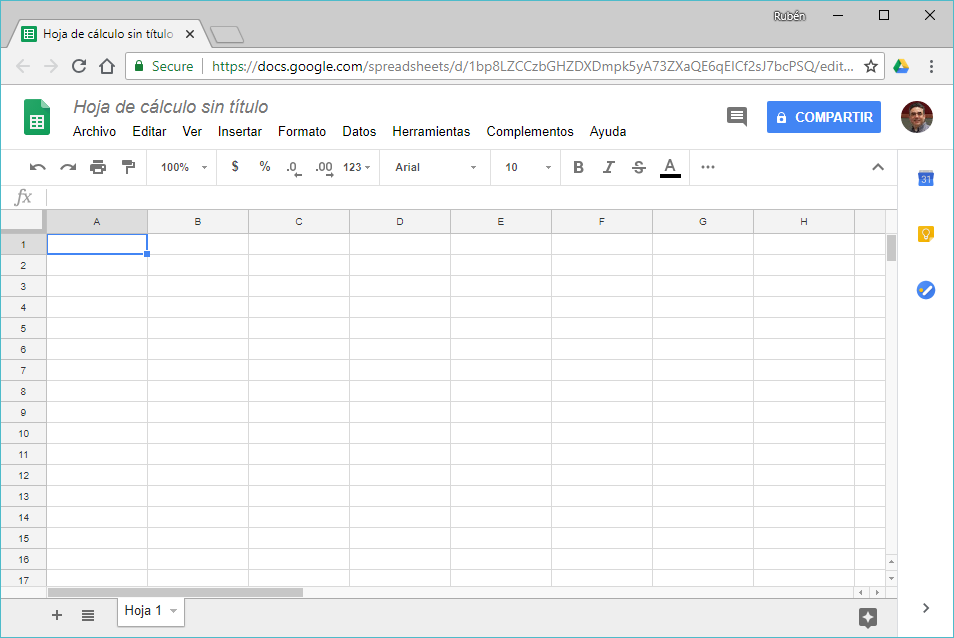 La semana pasada Google anunció en inglés el lanzamiento del panel lateral de acceso rápido incluído como una de las grandes novedades del nuevo Gmail en otros servicios. Pues justo hace unos momentos lo he visto en mi cuenta principal de G Suite. A continuación una captura de pantalla tomada en un nueva hoja de cálculo